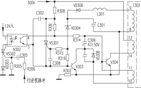 当C309的电容量下降不多时,偶尔也能启动,但输出直流电压将升高,开关变压器T302的正反馈绕组的{8}、{9}脚感生电压升高,经VD306整流、C301滤波的直流电压亦升高,使稳压二极管VD304、V303、VS301断续导通,使开关管V304的正反馈交流电压下降,开关频率下降,从而造成上述两种噪声。