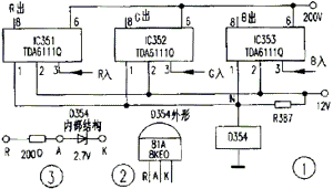 按常规首先检测末级视放级的供电电压,为200V正常(此类故障多是末级视放级滤波电容失效,致使供电180V下降所致)。检查末级视放级R、G、B三色采用IC351、IC352、IC353三只集成块,其型号均为TDA6111Q(见图1),