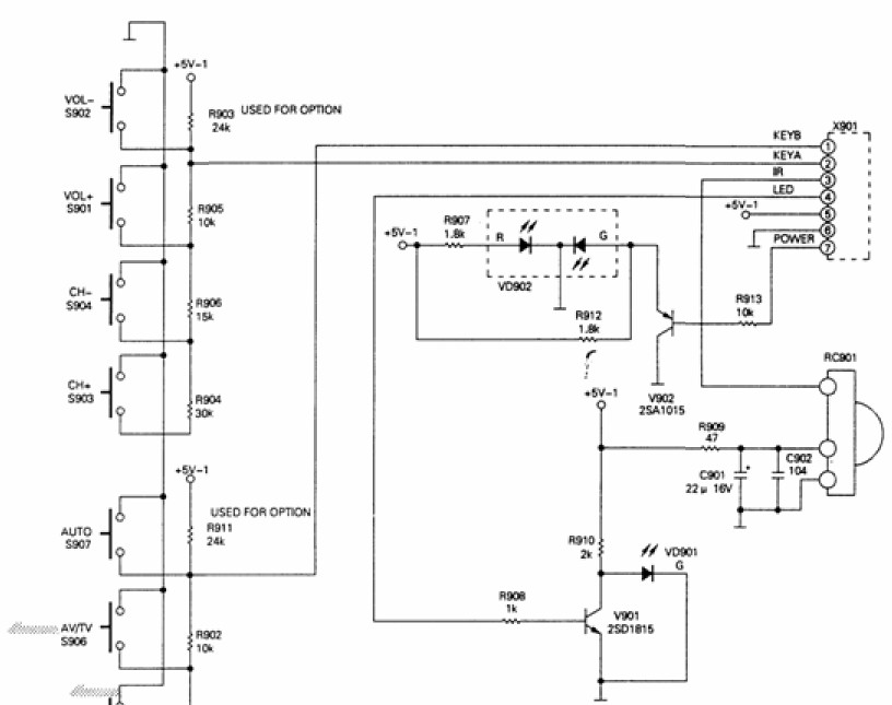 接下来就是恢复用户的遥控器的使用 从电路接线图可以知道,到面板的7芯*座检查5端为5V供电,6端接地线,3脚是红外线输入端子。外接一支三端红外线接收头,分别连接好有关线路,遥控器也恢复正常使用。这个电路见图: