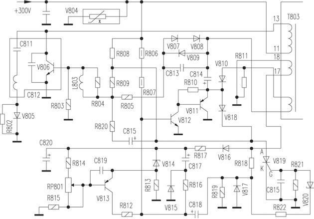 一台长虹D2526A型彩电开机呈现无图、无声、无光现象,电源指示灯也不亮。打开机壳,发现电源3.15A保险管内部烧黑,保险丝熔断,说明电源部分有严重短路故障。如附图所示,分别用开路法检查电容C809、压敏电阻V804、电源开关管V806,查得V806(图标为2SC4745,实物为C4706)已击穿短路,考虑到V806击穿短路有一定原因,据经验怀疑*近大功率电阻R811的电容C814(47μF/50V)有问题,但拆下检查正常。仔细观察,发现R811(22Ω/3W)一端焊点存在裂纹,以为这是故障根源所在,将其重新焊牢后更换调整管V806及3.15A保险管,并将C814换新,开机监测+B(+130V主电源电压)两端电压,还未来得及看清万用表指针摆动的位置,保险管又烧了,V806再次击穿。看来引起V806击穿的直接原因还未找到。仔细分析,电源调整管在开机瞬间就击穿,必须重点检查与开关变压器T803正反馈绕组、取样绕组相连的部分电路,查正反馈电路V807、V808、V809、C813等元件均正常,当查到与取样绕组相连的二极管V816(2CZ5295G)时,终于发现该二极管反向漏电严重,由此引起V806瞬间过压击穿。用现有的快恢复二极管RG2A代换V816,用正品C4706换下已损的V806,装上3.15A新保险管,监测+B电压和行电流,测得主电源电压+130V正常,无信号呈蓝屏时行电流为300mA,故障排除。