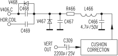 图中,C309为场锯齿波电流输入电容,方框内为枕校主电路,包括场频抛物波的形成、放大电路,V467调制电流的改变是通过改变C467上的电压,来控制它的导通程度达到正确调制目的的。