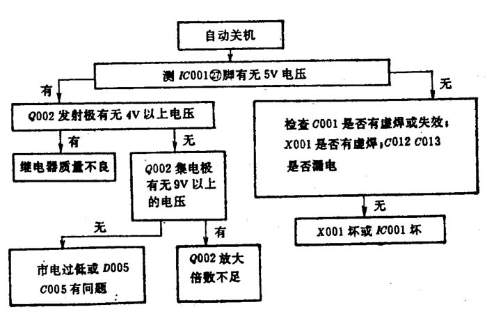 (4)继电器本身质量不良。 自动关机故障的逻辑检修程序如图,检修时,应首先测量M50431(IC001)27脚有无5V电压,若有5V电压,则说明IC001、X001、C001良好,且C001、X001也无虚焊,C012、C013也无漏电。问题在Q002、K901、D005、C005或市电过低。这时,应测Q002发射极有无4V以上电压。若有,则是继电器K901质量不良;若无,则再测Q002集电极有无9V以上的电压。若Q002集电极有9V以上电压则是Q002放大倍数不足;若无9V以上电压,则是市电过低或D005、C005有问题。若系市电过低造成自动关机或无法开启主电源,可采取如下措施:将R009改换为39KΩ的电阻,或取样Q003和R009,再将R004改接在Q001发射极上,还应将Q002改换β较大的管子。