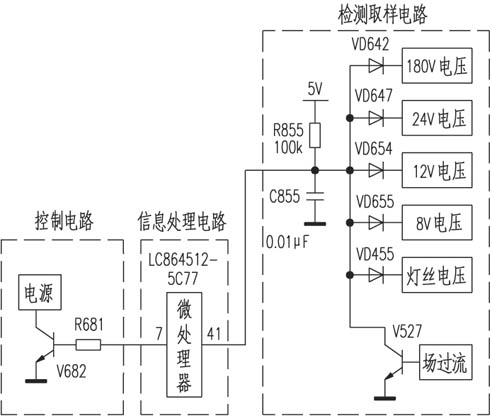 根据保护电路的特点,可以强制微处理器{41}脚为高电平。即断开{41}脚与外围铜箔的连接,把5V电压通过10kΩ电阻加到{41}脚,此时{7}脚将输出高电平开机指令,+B电压恢复正常。说明故障在检测电路,此时应重点检测各二极管的检测取样电路电压。如果{41}脚仍为低电平,一般为微处理器损坏。这种方法能较快的找到故障点,但可能使原来被保护的元件烧毁,所以应边开机边测量,发现有过热或冒烟现象应立刻关机。