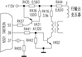 试机观察故障现象,与用户反映的情况一致。故障出现时,测附图中+115V端电压正常,行输出变压器{2}脚电压约为112V,行推动管V402 b极电压为0V,行振荡信号输出端N501{39}脚为0V,正常时为2V。说明N501内部行振荡电路已停振,而造成N501内部行振荡不能工作的原因有:N501的供电电压不正常;X射线保护电路动作迫使行振荡停振;N501或{37}脚外接晶振热稳定性不良。测N501X射线保护端{52}脚电压接近2V,正常工作时其电压为0.2V,说明行振荡停振是X射线保护。X射线保护有过压保护电路和过流保护电路,电源电压+115V正常,证明不是过压保护而是过流保护。过流保护电路由R435、V431及其偏置元件组成。其保护电路的原理是:当行输出电流过大时,R435两端压降增大,V431由截止变为导通,其c极电位升高,通过R437使N501{52}脚电位升高,X射线保护电路动作,迫使行振荡停振,起到保护作用。查V431、R435、R436等元件,发现R435由正常值0.56Ω变为5Ω,更换R435后故障排除。