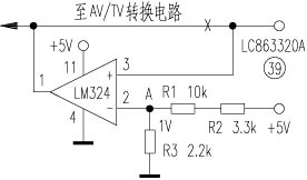 此机采用三洋A12机心,微处理器N701为LC863320A。开机测得N701{39}脚电压在TV、AV2时为0V,正常;而AV1、AV3、S状态时为1.4V不正常,正常应为4.5V高电平。割断N701{39}脚外电路,测其电压不变;判定{39}脚内部电路遭雷击损坏。N701{39}脚电压在0/1.4V变化不能满足转换电路的要求,但这一变化的电压也为修复工作提供了条件。笔者用现有的四运放LM324,搭接成如附图所示电路,在不换LC863320A的情况下修复了此机。即将附图中“A”点电压调为1V(调整R1或R3),此时测LM324{1}脚电压能随LC863320A{39}脚的电压在0~5V变化即可。