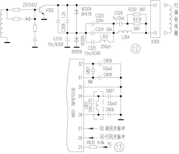 无字符显示一般由以下几方面造成:字符发生器、CPU、行场同步脉冲等异常。由于该机仅无字符显示,其他功能均正常,初步判断是字符发生电路异常。该机CPU采用东芝TMP87CH36芯片,与字符有关的引脚是{22}脚ROSD、{23}脚GOSD、{24}脚BOSD、{25}脚YS、{26}脚HD行同步脉冲、{27}脚VD场同步脉冲。{28}脚OSC、{29}脚OSC字符振荡线圈(见图13)。对上述引脚进行检查,发现{28}、{29}脚外接的L801中周已开路,用新中周更换后故障排除。