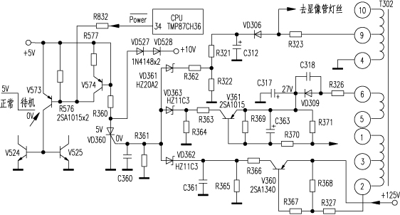 该机遥控电路未设专用的电源,无论在正常工作状态或待机状态,遥控部分电源均由开关电源提供。在待机状态时,开关电源工作在低频间歇振荡状态,各路输出电压均降为正常状态的50%左右。根据故障现象判断,开关电源工作正常,故障应与电源负载过载保护电路有关。该机负载过载保护电路如附图所示,主要由V573、V574、VD527、VD528、VD360、VD361、VD362、VD363、V360、V361等元件构成四路过载保护电路。在正常工作状态下,除V573导通外(因CPU{34}脚输出低电平开机指令)其余保护控制电路均处于截止状态,V574的Vb为5V,VD360可控硅VA=5V、VG=0V。当行输出级异常造成125V负载电流增大时,检测电阻R368上压降增大,使V360b极电压下降而饱和导通,其c极输出125V电压,经R366、R365分压,在R365上的电压大于11V,使稳压管VD362击穿导通,VD360G极得电而导通,使其VA由5V下降为07V,+5V电压经R577、R360、VD360分压使V574正偏导通,其c极输出5V电压加至V573b极,使V573b极电位提高而截止,V524、V525亦截止,通过对开关电源的控制而使整机进入保护停机状态。当场输出级出故障引起27V供电过流时,经R371检测后使V361饱和导通,其c极输出27V电压,经R363、R364分压,在R364上的电压大于11V,同样使VD363击穿导通,引起VD360导通,V574导通、V573截止,V524、V525截止,整机进入保护状态。当某种原因引起行逆程脉冲电压过高时,取自行输出变压器T3029脚的脉冲电压经VD306、C312整流滤波后,再经R321、R322分压使R322上压降大于20V,则VD361击穿导通,同样使VD360导通,V574导通而进入保护状态。当开关电源10V输出负载短路造成10V电压消失时,同样使V574导通而使整机进入保护状态。从上述分析可见,四路保护电路中无论哪一路动作,都会造成可控硅阳极电压下降,所以可控硅阳极电位的检测是检修保护电路的关键点。