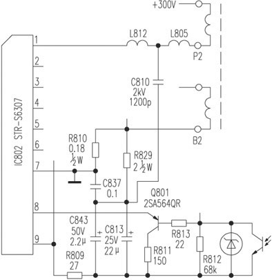 该机的故障现象为无光无声,查保险丝F801(3.15A)已熔断,电源厚膜块IC802(STR-S6307){1}、{2}、{3}脚(即内部开关管c、e、b极)已击穿。将IC802焊下后对其外围元件进行检查,发现稳压控制管Q801各极均已击穿,其他未见异常,怀疑Q801不良损坏引起IC802损坏。选用功率较大的A966代换Q801,将IC802换新,为防止意外又将行负载断开,接入60W灯泡作假负载试机,刚开机时监测主电源电压为140V正常,但约10秒钟后灯泡熄灭,查保险丝又熔断,IC802内部开关管各极又击穿,而新换的A966却没有损坏。作进一步检查,发现充电电阻R829(2Ω)已烧断,是什么原因引起R829烧断已成为该故障的关键所在。见附图,R829与-9V供电滤波电容C843、C813正极及C810(1200pF/2kV)一端相连,而C810另一端接IC802{1}脚即300V供电端,该端在开关电源工作时将产生上千伏尖峰电压,通过C810将其吸收。由此怀疑C810不良,将C810焊下检查,的确已漏电短路。经观察,C810上的标称耐压值仅为1kV,而图标值为2kV,很明显为耐压不足而引起击穿漏电。将R829、C810、IC802重新更换,开机测主电源输出电压140V正常,连续试机无异常,拆下假负载接入行负载试机,故障排除。此后又遇一台该机型烧IC802的故障,经查又是C810漏电引起,看来这是该机型的一个通病,望引起同行注意。