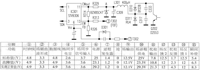 该机采用集场输出与枕形校正电路于一体的新型集成电路STV9306。从故障现象看似为某元件接触不良,仔细补焊IC301(STV9306)各脚及相关元件后无效。测IC301各脚电压与维修数据比较相差较大(见附表),怀疑IC301性能不良,但换新后故障依旧。针对电压误差较大的相关引脚外围元件检查,发现其电源供电保险电阻R316(0.68Ω/1W)阻值已增大为18Ω。换新后实测IC301{6}脚电压为29.2V,图像压缩故障不再出现,但图像水平方向呈锯齿栅栏条状,且行幅偏大,并有枕形失真。