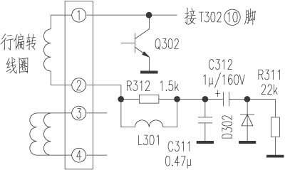 据机主反映:该机在使用中突然行幅收缩,接着机内冒烟,立即关机;第二天开机又能收看,但不定期出现同一故障,拍打机壳,偶尔故障会消失,就这样让机子带病工作了数月。后来拍打机壳无效才送修。根据接机后的观察和机主反映的情况分析,可能是行幅线圈L301引脚接触不良,当L301脱焊时,由于R312的阻流作用,使流经行偏转线圈的偏转电流减小,水平偏转磁场变弱,造成行幅不足。同时,R312经受不起大电流的冲击,导致严重发热烧焦,且发热变值,其电阻值逐渐变大,引起行偏转电流进一步减小,于是行幅越来越窄。
