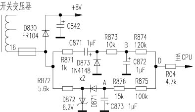 从电原理图可以看出,从开关变压器{16}脚输出的脉冲电压分两路:一路通过R872经D872稳压,D871钳位使A点电压稳定在-5.5V;另一路经R871、C871、D873倍压,使B点电压在+12V左右。A点和B点电压经R874、R875、R876分压,如电网电压220V正常时,则在D点形成+3.2V左右的基准电压,经R04送至CPU进行电压检测。当电网电压发生变化时,B点电压跟随变化,使D点基准电压+3.2V产生偏移,CPU根据基准电压的变化大小来显示和判断电网电压的高低或进行保护关机。
