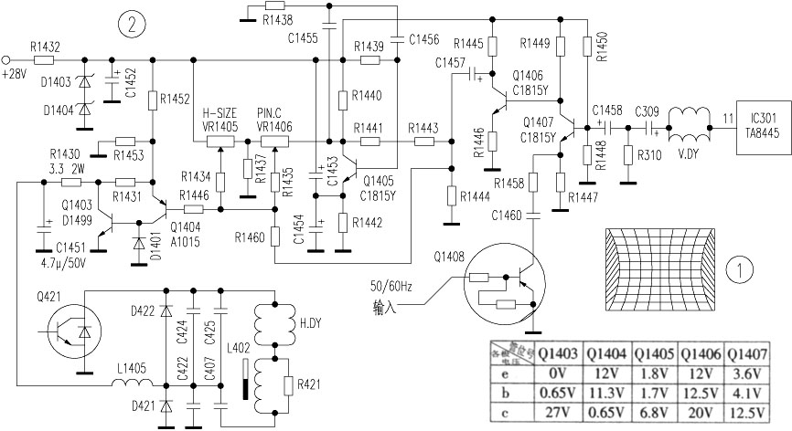 从故障现象分析,判断故障出在左右枕形失真校正电路,原理图如图2所示。其工作原理是:场输出块IC301(TA8445){11}脚输出场锯齿波电流,经场偏转线圈、C309在R310(1Ω/1W)两端形成幅值为1.5Vp-p的锯齿波电压,经C1458耦合到Q1407 b极,其耦合幅度受Q1408工作状态的控制。即在接收50Hz场频信号时Q1408截止,在接收60Hz场频信号时Q1408导通,以保证在此方式下仍能获得足够的锯齿波电压幅度。Q1407、Q1406及其偏置回路组成场锯齿波前置放大电路,Q1405及其积分网络阻容元件组成场抛物波形成电路。其中,Q1405为场频抛物波形成管,其b、c极间接有C1455、C1456、R1438组成的T形积分网络,e极接有C1453、C1454、R1442组成的积分网络。正是由于这两个网络的共同作用,使Q1405 b极输入的线性良好的场频锯齿波电压转换为上凸场频抛物波电压,并从其c极输出,经R1467、VR1406、VR1405、R1466等进行枕形校正及幅度调整后作用于Q1404 b极,经Q1404、Q1403放大及倒相后在Q1403 c极输出下凹场频抛物波电压,经R1430加到枕校电容C1451正极,与其上直流电压叠加后形成调制电压,再通过电感L1405作用于S校正电容C407,这样C407两端电压被场频抛物波调制成上凸抛物波电压。而后此电压作用于行偏转线圈。调节VR1406,就可调整加到Q1404 b极的抛物波电压幅度,从而调整枕形失真校正量。V1405是行幅调节电位器,通过调节VR1405可改变Q1404、Q1403的直流偏置电压,从而控制枕校电容C1451两端的直流电压,达到调整行幅大小的目的。当C1451两端电压偏高时,行幅缩小;反之,行幅增大。C1451两端的直流电压由场频抛物波放大管Q1404、Q1403的工作状态决定。