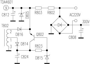 该机采用自激并联型开关电源,核心部分由TDA4601等组成。测其{9}脚电源端电压为0V,正常值应为12V。断电后用万用表R×1挡测{9}脚对地阻值很小,查其外围件,发现过压保护稳压管D805(稳压值16V)击穿(见附图)。将D805换新后试机,机内有吱吱声,+B端电压在50~70V之间波动,TDA4601{9}脚电压在10V左右波动,显然是{9}脚电压异常造成的。在刚通电时,市电经整流桥半波整流,经由R802、R803为TDA4601{9}脚提供启动电压,电源启动后改由Q802、D815组成的12V稳压电路供电。重点检查Q802、D815,发现Q802开路,D815击穿。将Q802(2SC2230)用2SC2482代换,D815用12V稳压管代换后恢复原电路试机,故障排除。
