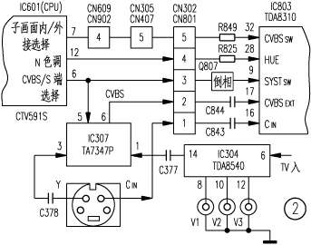 IC8039、{16}、{17}、{20}、{32}脚组成输入开关转换电路,并受CPU7脚输出的开关转换信号的控制,以选择内/外接信号。当输入低电平至IC803{32}脚时,控制电路接通{20}脚输入的PIP子画面TV信号;当输入为高电平时,切换至{16}、{17}脚来的信号。该信号又分两种情况:第一种情况,当置于S端子输入时,CPU6脚输出高电平,控制转换集成块IC3075脚,使接于IC3073脚的S端子亮度信号→IC3076→CN3022→CN8012→C844→IC803{17}脚,色度信号→CN3021→CN8011→C843→IC801{16};第二种情况,当置于其它三路AV信号或主画面TV信号输入时,从视频转换集成块IC304{14}脚耦合至IC3071脚的复合视频信号,在CPU6脚低电平的控制下,切换到IC3076脚输出,从{17}脚输入IC803。IC8039脚因受CPU6脚高电平控制,关闭色陷波器和色带通滤波器,S端子输入的亮/色信号至{16}、{17}脚,不再经过Y/C分离电路直接进入下面的解调电路;当CPU6脚为低电平时,IC803打开色陷波器和色带通滤波器,将IC803{17}脚输入的复合视频信号({16}脚空置)分离成Y、C信号再进入下面的电路。