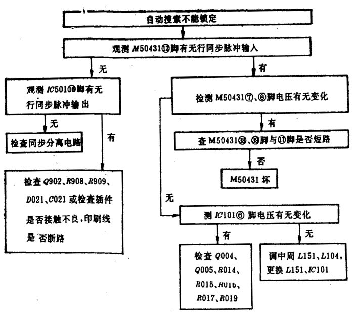 若屏幕出现图象时,M50431的12脚有足够幅度的行同步脉冲输入,则应进一步检测M50431的7、8脚电压有无变化。无信号时7脚为OV、8脚为5V,信号出现时,7脚电压在0~2.5V间变化,8脚在2.5~5V间变化。若7、8脚电压有变化,则说明自动搜索功能的基本条件具备、不能锁定的原因是:M50431坏或M50431的38、39脚与17脚短路。值得注意的是,38、39脚与17脚短路,还同时造成其它所有功能失控。若7、8脚电压无变化,则应进一步测图象中放IC101的6脚输出的VAFT电压有无变化(6脚VAFT在无信号时为6.5V,信号出现时VAFT以6.5V为中点上下摆动几次,最后回到6.5V)。若无此变化,则说明中放电路有问题,一般是AFT检波中周L151或图象检波中周L104未调准(特别是L151),或IC101有故障。大多数情况下微调一下L151或L104即能解决问题,必要时应更换L151或IC101。若IC101的6脚电压有变化,而M50431的7、8脚电压无变化、则故障一定是由IC101的6脚至M50431的7、8脚间的元件故障造成,应检查R014、R015、R016、R017、R019或更换Q004、Q005。