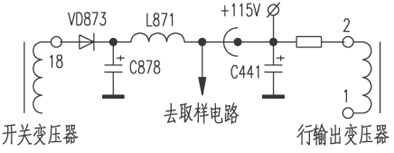 根据故障现象分析,应首先检查开关稳压电源电路。测主电源输出电压只有+95V(正常值为+115V),在转换频道即出现故障的瞬间,发现主电源由+95V下跌至90V后又升至+95V;当出现稳定的行幅缩小故障时,主电源电压反而上升至+110V。试用200Ω/200W电阻作主电源负载,测主电源升至115V,且很稳定。据此分析,认为开关稳压电源基本正常,可能是主电源的滤波电容不良或其负载有故障。更换滤波电容C878(330μF/200V),故障依旧。测行输出级电流为380mA,正常。为了确定是开关稳压电源故障还是行扫描电路故障,用长虹2169型彩电的开关稳压电源代换该机开关稳压电源试机,故障消失,表明故障在开关稳压电源部分。查电源振荡电路及保护电路无异常,取样电路及控制电路也无故障,怀疑开关稳压电源次级滤波电路有故障,见附图。主电源(+115V)由C878、L871及C441组成的滤波器滤波,取样电路的取样点在C441正极,若C441失效,行脉冲在电感L871上的压降被取样后,将对开关电源进行调制,造成开关稳压电源输出电压的波动变化。用示波器观察C441两端波形,果然有45Vp-p的脉冲电压,而C878两端却没有该脉冲电压。更换C441后开机,故障排除。