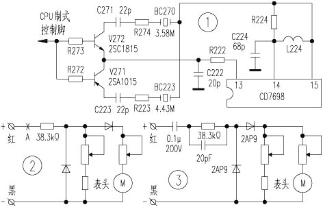 与色副载波振荡电路有关的引脚为{13}、{14}、{15}脚,相关电路见图1。因正常机CD7698{13}脚的色副载波振荡频率为4.43MHz,而普通万用表交流挡仅能测45~1000Hz的交流信号,故笔者将MF47型指针表交流10V挡作如下改装后来检查色副载波信号: