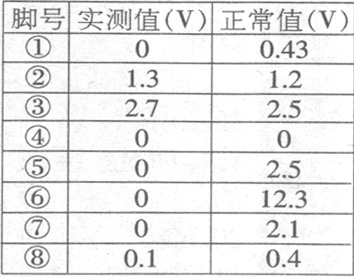 直观检查,F801完好,V840无异常。通电测C809两端电压为297V正常,测TDA4605各脚电压值与正常值比较,有较大差异(见附表)。关机后检查,R802断路,测TDA4605{6}脚对地电阻值约8kΩ左右,基本正常。更换R802(33kΩ/2W),试机恢复正常,但使用不久故障重现。经检查,又是R802断路。仔细分析电路,R802只提供开机时的启动电压,待开关电源正常工作后则由T803{6}脚经VD819整流及C820、C819滤波后为TDA4605供电。进一步检查,发现VD819断路。VD819的型号为RU2,用在此处其参数余量应完全足够,分析可能是元件自身质量问题造成的。更换VD819、R802,试机二小时后关机检查,R802仅有微温,VD819温度正常,至此故障排除。