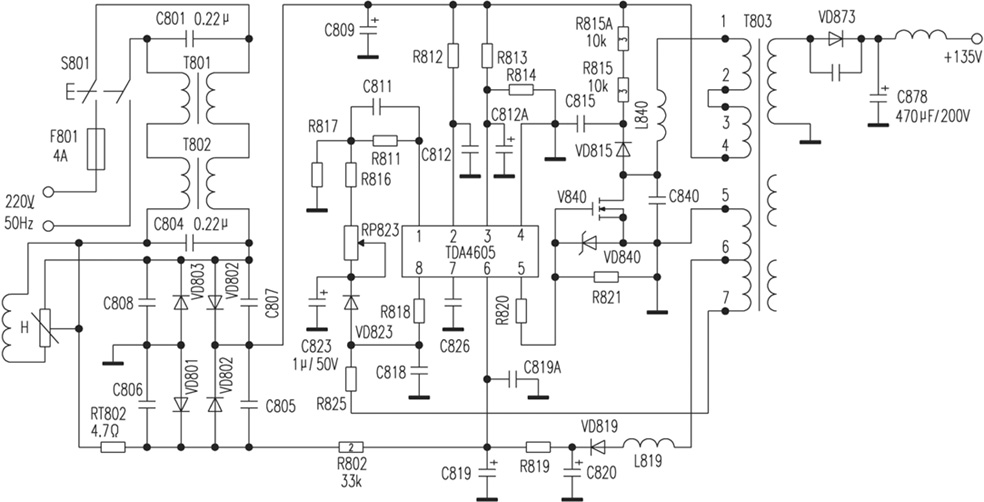据故障现象分析,首先检查开关电源电路,见附图。开机时,半波整流的供电电压经R802限流及C819滤波后,为TDA460{6}脚供电,内部软启动电路动作,启动内部脉冲发生器,由{5}脚输出控制脉冲,控制V840场效应管工作在开关状态。开关变压器反馈绕组经{7}脚为TDA4605{8}脚提供反馈信号,并通过VD823整流、C823滤波后得到与次级输出电压成线性关系的检测电压,经RP823、R816、R817分压后输入TDA4605{1}脚(稳压反馈信号输入端),通过内部控制和过载放大电路,控制{5}脚输出的脉冲宽度,以达到稳定输出电压的目的。当TDA4605启动正常工作后,由T803{6}脚输出脉冲电压,经VD819整流及C820、C819滤波后为TDA4605{6}脚供电。