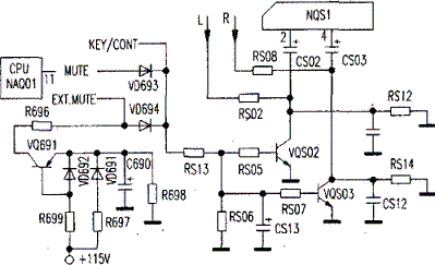 该机设有多路静噪控制电路,包括 KEY/CONT、CPU MUTE、防开关机冲击静噪、EXT MUTE等(见附图)。测静噪公共点VD694负端有1.2V电压,分析此电压应足以使静噪管VQS02、VQS03弱导通从而旁路音频信号。为证实,焊脱电阻RSl3,试机音量恢复正常,考虑到在各路静噪电路中,由 VQ691等元件组成的防开/关机冲击电路与115V相连,故障率应相对较高,测VQ691 b、e极电压为110V,而c极为9.1V,正常工作时c极电压应为0V.即 VQ69l应为截止状态,证实V969l已损坏。将VQ691(2SA949Y)换新后恢复RSl3试机,故障排除。