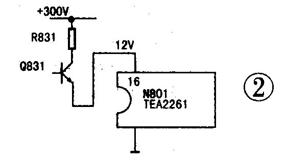 从测量数据看,TEA2261无信号输出是因其电源电压不够引起,原因一是集成块TEA2261内部不良;二是TEA2261供电电路故障。先换一块TEA2261试机,效果同样,开关电源仍不启动。后查供电电路三极管Q831、电阻R831等元件,发现电阻R831阻值误差甚大,图纸注明 2W3.3k,实测是64kΩ,故认为电阻R831阻值变大引起TEA2261供电不足,就将R831改为2W3.3kΩ。通电试机,量N801的16脚电位,已达12V,但手摸电阻R831、三极管Q831温度较高,已烫手,就立即关机。