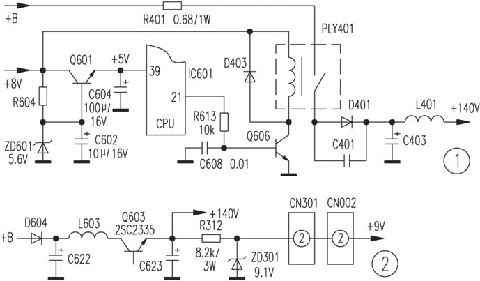 本机采用以继电器断开行扫描供电的方式实现遥控开/待机功能(见图1),其控制原理如下:正常开机时CPU{21}脚输出高电平,Q606导通,继电器PLY401开关触点被吸合,行扫描电路获得+140V电源开始工作;待机时,CPU{21}脚转为0V低电平,Q606失去偏压而截止,PLY401触点释放,行扫描电路停止工作,达到待机目的。测Q606 b极和CPU{21}脚电压均为0V,且不随遥控开/待机*作而变化,测CPU{39}脚+5V供电电压仅在4.3V左右摆动,稳压调整管Q601 b极电压为4.9V(正常值为5.6V),而c极+8V供电正常。检查Q601 b极稳压及偏置元件R604、ZD601和C602,发现ZD601热稳定性已明显变差,用一只5.6V/0.5W稳压管更换后故障排除。