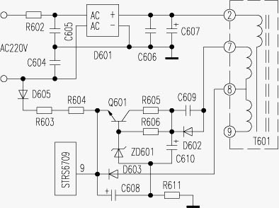 仔细观察,开关电源部分STRS6709厚膜块及其相关阻容元件未见异常,开机测C607两端300V电压正常,而C626两端主电压为20V,且跳动。关机切断行电源并接上60W灯泡作假负载,开机灯泡微红并闪烁,说明故障在开关电源部分。测STRS6709{9}脚电压为6V且随“嗒嗒”声跳动。分析{9}脚电源供电由三条支路提供:(1)开机时交流市电经D605、R603、R604为STRS6709提供启动电源,促使STRS6709内部振荡器工作;(2)启动后刚开始时T601{7}-{9}绕组电势经D602、C610整流、滤波,再由Q601、ZD601、R606等稳压成+7V供电;(3)正常工作后由D603、C608整流滤波得到+8.5V电压供电(见附图)。检测这三条支路元件,发现7.5V稳压二极管ZD601反向击穿,换一同规格的稳压二极管后故障排除。