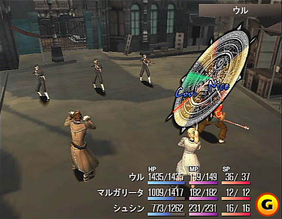 战斗画面应该不难理解,系统跟FF系列很像不过攻击时会有个圆盘,决定时它有个指针在上面转动主要在指针通过有颜色的部份就要按一次,而每个颜色的末端颜色会不一样,如果有按到那攻击威力会增大,每个人能力中有SP这项数值角色每行动一次就会扣一点,扣到没有人物就会暴走,而在暴走状态结束战斗所得经验值会减少很多。而每个角色的特殊能力不同,主角的能力是变身,至于其他的角色等出现时在介绍........