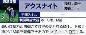 同时拥有高攻击力和高防御力的主战骑士,虽然是下级兵种但却能装备M盾(中等级盾),重要的盾兵种。