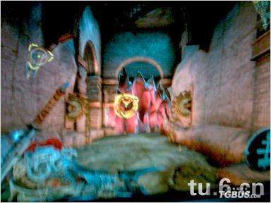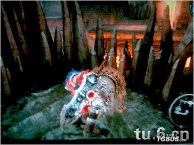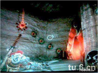 在下面我们会找到一块石头,击打石头后我们会得到回旋手里剑。按RS是瞄准,Rt是蓄力,注意如果你老是不放手的话你自己会被剑炸伤!这时出现一个敌人,他浑身发黄光时打他不会对他造成伤害,只有先用手里剑把他的黄光打掉才能攻击他。干死敌人后用手里剑击打门上面的蓝色光点就能出去了。