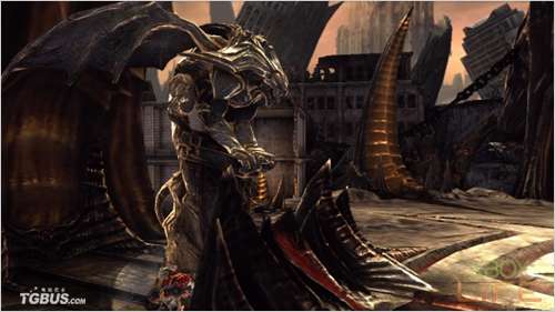 从电梯井往上爬到达下个区域,前方出现的结界与殭尸群会封住War的去路,并出现熔岩状双腕的Gholen。Gholen的动作不快,但挥拳攻击的威力与范围都不小,还有一定机率会发动双手搥地的熔岩波攻击,玩家可以适时利用RB键的闪避功能进行走位,从牠的死角攻击。 The Crossroads 杀光敌人、继续前行,就能走出Seraphim Hotel来到the Crossroads:War(还有Watcher)遇上此行的目标之一,恶魔商人Vulgrim。Vulgrim知道War的目标,指着远处的高塔,告诉他那里就是Destroyer的所在。但是,Vulgrim也提醒War的能力已不如以往,直接找上Destroyer必定死路一条;另外,前往高塔的路上有许多黑暗魔法作用着,War得另找高明才有机会越过。Vulgrim可以提供指点,不过条件是要War拿灵魂来交换才行。 接下来,玩家要在the Crossroads这个区域里收集500点的蓝色灵魂。Vulgrim会帮War在地图上标出区域里的宝箱位置,玩家按图索骥开宝箱收集蓝魂即可。收齐足够的蓝魂后回去找Vulgrim交差(迷你地图上浅蓝色的记号),Vulgrim会给War一把名为唤土(Earthcaller)的号角,装备这柄号角后按下RT右发射键,可以唤醒被Destroyer所束缚的Tormented Gate(先前曾出场过的巨大岩像),打开通路通往新的区域。交易之后,玩家也可以前往地图上的特定地点找Vulgrim交易,购买新的招式、装备与道具。如果玩家曾在Option里的Game Options选项下方之密码兑换区输入“The Hollow Lord”(大小写需一致),可以向Vulgrim免费兑换Harvester镰刀一把。 Scalding Gallow 用号角唤醒Vulgrim背后的Tormented Gate(地图上黄色光点的所在),穿越废弃的图书馆后,可以抵达Scalding Gallow。一路直走(左前废墟上方有个宝箱),前方就是在此充当恶魔Samael狱卒的恶魔将领,Phantom General。虽然号称是将军,但攻击模式其实和一般兵卒差不多(玩家甚至可用号角将他“吹”倒),比较特殊的是牠会召唤兵卒出来帮忙,但只要适时的闪躲与格挡,就能轻松解决掉牠。 把外乾中也乾的Phantom General干掉以后,将牢狱两侧的巨大雕像朝中央移动(如图所示),就能解开枷锁,唤醒号称拥有绝大魔力的Samael。