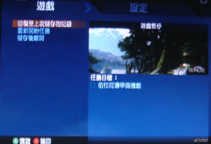 进入游戏选单後可以选择回复到上次储存的记录、重新开始任务或者储存後离开,并且提示你现在的任务目标,还可以进入设定选单进行控制外观语音游戏画面的设定。
