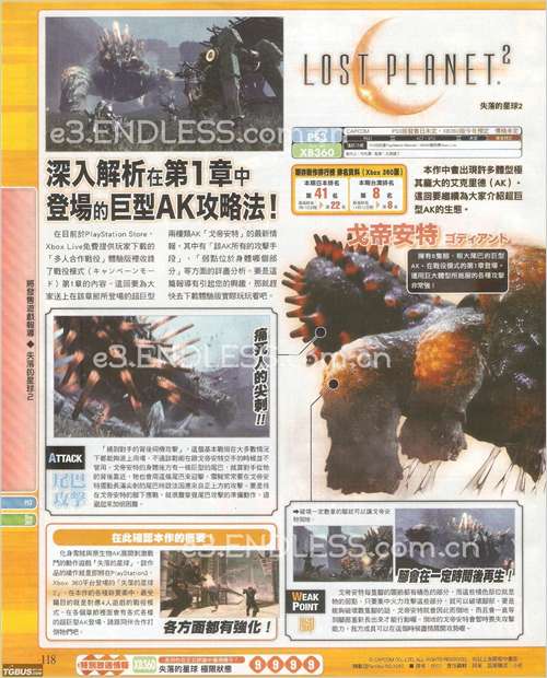 《失落的星球2》发售日还遥遥无期,幸好CAPCOM公司提供了游戏的Demo来让玩家现行体验游戏精彩之处。相信大家对首次登场的BOSS艾克里德还记忆犹新吧!它有些难以对付,不过不要紧,《失落的星球2》首次中文杂志攻略图到来,它向我们详细介绍了对付这个巨大AK的办法。